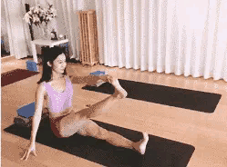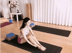 - 坐在瑜伽墊上,分別用左手拉右腳腳趾,並斜上方45度伸直腿部,
