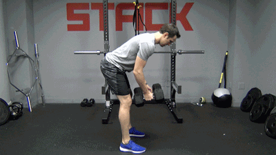 注意:雙手握住啞鈴時,手臂可以略微內旋,相當於在做開肘劃船動作,打開的角度更大。