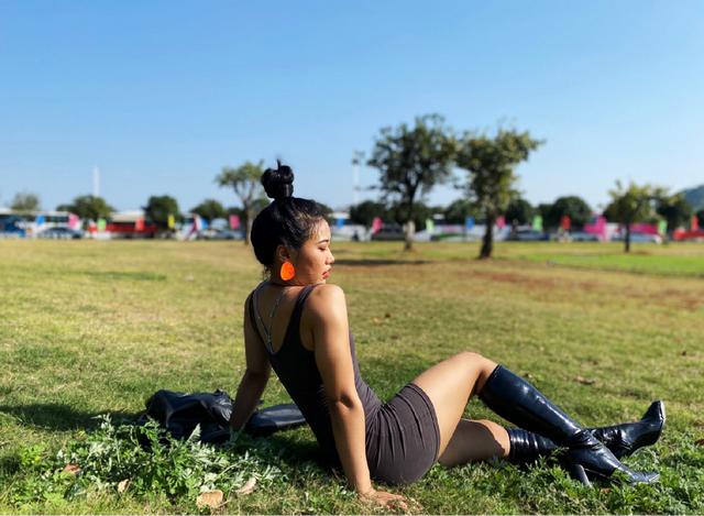 在大腿中間位置纏上彈力帶,然後深蹲跳訓練動作。