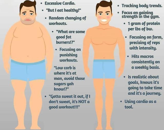 相反的,正確的做法為:重視力量訓練,以循序漸進、強度到位、姿態准確的訓練為目標;確保熱量合理、蛋白質攝入充足,並均衡結合碳水、脂肪等營養物質;設定切實可行的減脂目標,不要急於求成,定期記錄身材變化,一步一個腳印地靠近、達成目標。在此基礎上,有氧運動可以作為輔助、加速減脂的一種工具。