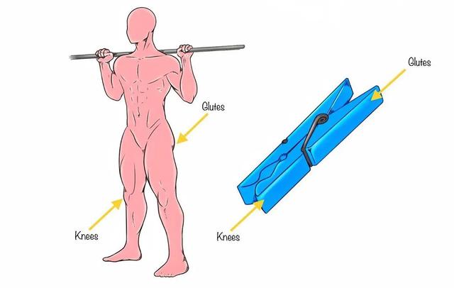 當你下蹲時,想像臀部如夾子般夾緊,夾子的兩端便是你的膝蓋,向外打開。而當你站起時,膝蓋就如同夾子兩端那樣內收還原,同時臀部肌肉放鬆復原。