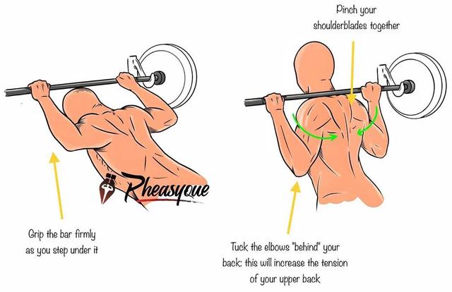 因此,接下來我們要給大家強調一下以下3個核心要點——首先,在抓握好槓鈴之後,確保兩側肩胛向中央擠壓收緊,手肘內收靠近背部;如此一來才能確保整個背部肌肉有力收緊、受力。