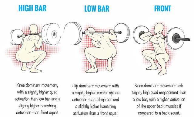 此外,不同的深蹲練習方式,對於不同肌肉的刺激、強化效果也有所不同——首先,由雙膝主導動作的高槓深蹲,較低槓深蹲而言,股四頭肌強化效果較好;較頸前深蹲而言,屈繩肌所受的刺激效果更強。