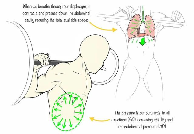 緊接著,深深地吸入一口氣通過隔膜,進入腹腔;此時大家會明顯感覺到自己的腹部被向外撐開。由此,營造出一種「腹內壓」狀態,在高強度的深蹲動作中大家需要維持這種狀態,以保障身體更為平衡、穩定。