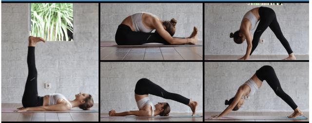 腿部:上升腿式、 雙腿背部伸展式、犁式、加強側伸展式、下犬式