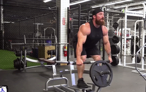 動作過程:保持身體的穩定,雙臂向上拉動槓鈴,背部肌肉的發力很強,最高點保持動作1秒,然後慢慢降下槓鈴,回到起點,重復動作。