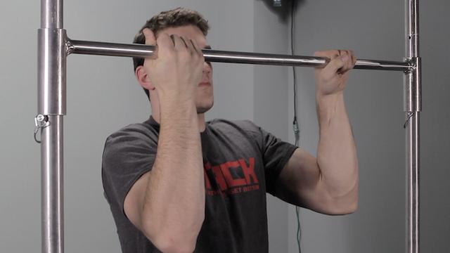 像常規引體向上一樣拉起自己,確保每一組的每一側都換過相同次數握距。
