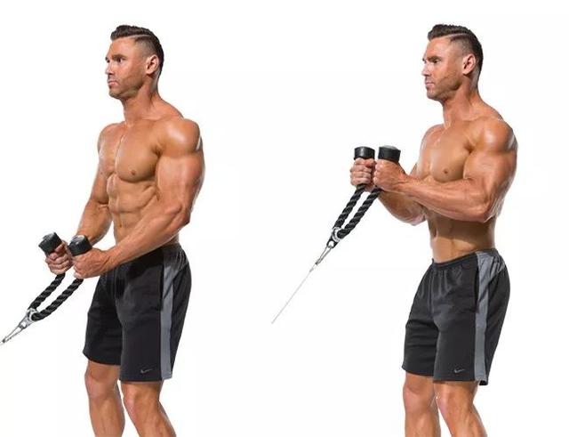 繩索可以給肌肉施加持續的張力,激活到所有的肌肉纖維。當你把繩索往上舉的時候,手肘不要向外打開或向前移動。上臂穩定。