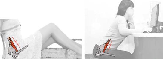 另外長時間以嬰兒蜷曲的坐姿、坐辦公桌前時身體過度前傾或是把腳掌踩在椅腳上、坐沙發時抬腳放板凳上,這都會使膝關節高於髖關節,因而使髂腰肌長時間處於收縮的狀態,也容易產生症狀。此外,住院的病人坐床上過久,或是坐在床上玩手機,也易發生症狀。