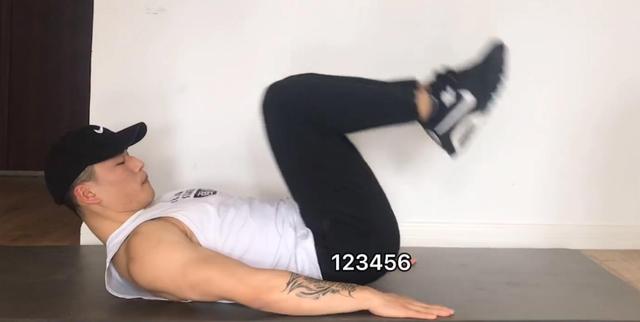第三個動作仰臥交換抬腿,臀部、腰部、背部貼近地面,同時雙手放在身體兩側,左腳抬起來,腳伸直盡量伸直,腳跟抬起來,右腳的話是放下來,但是不要碰壁,離地只有兩厘米左右,兩只腳交換,腹部發力不要太快。