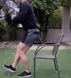 - 背對椅子,調整身體位置,單腳站立,非支撐腿微微向前抬起,背部挺直,核心收緊,雙手於胸前握拳