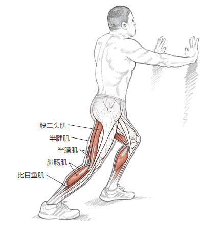 2. 雙手輕輕地壓向牆壁,伸展腿慢慢用腳跟壓地,感受腓腸肌的拉伸。