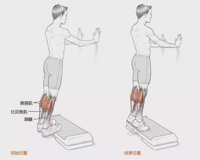 1. 雙腳站在台階上,腳跟懸空在台階外。雙手抵住前面的牆壁。