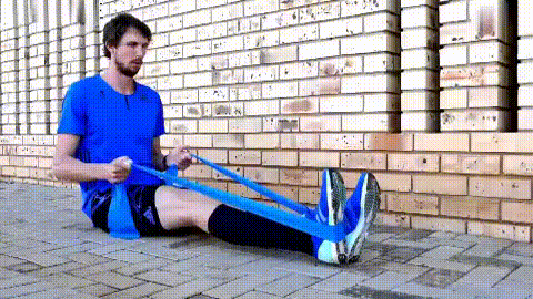 - 坐在墊子上,挺胸收腹,一條腿向前伸直固定不動,另一條腿向前伸直,腳踩住彈力帶中間位置,雙手拉住彈力帶兩端