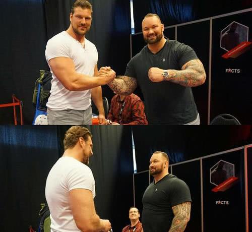 世界上最強壯的男人艾迪霍爾,拿了很多大力士冠軍,創造了硬拉500公斤的世界記錄,2米06的身高,和Olivier同台的時候,還是要小了一號。