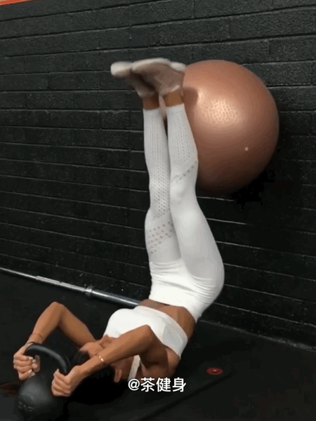 面對牆壁坐在地上,用雙腳踩住健身球,使健身球懸空,然後做仰臥起坐動作。
