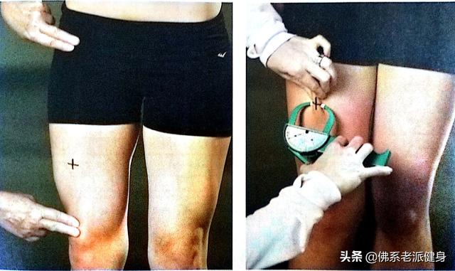 大腿:在髖部腹股溝褶痕和髕骨近端邊緣之間的大腿前正中線上取垂直皮褶(如下圖)